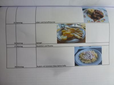 Jetzt starte ich einen neuen Versuch, das Ganze zu vereinfachen. Ein Jahr lang (ich habe im Januar angefangen) notiere ich täglich in einer Excel- Tabelle, was ich gekocht habe, möglichst ergänzt durch ein Foto. Mein Fotoapparat liegt daher auch meistens in der Küche herum. Monatlich drucke ich diese Notizen aus und hefte sie ab.